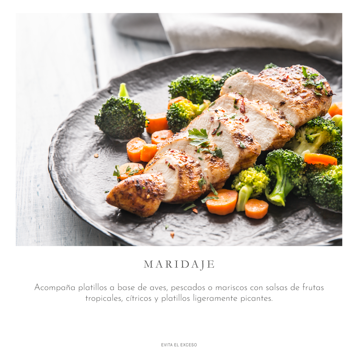 Acompaña platillos a base de aves, pescados o mariscos con salsas de frutas tropicales, cítricos y platillos ligeramente picantes.